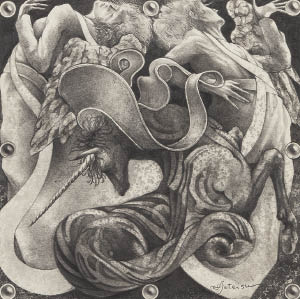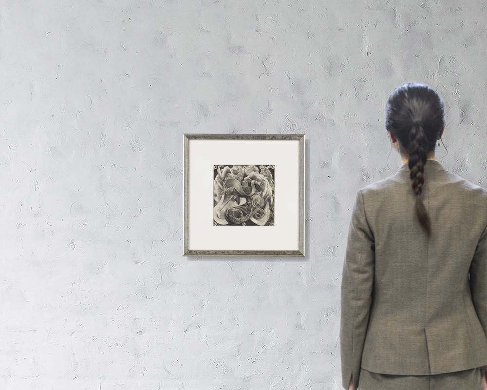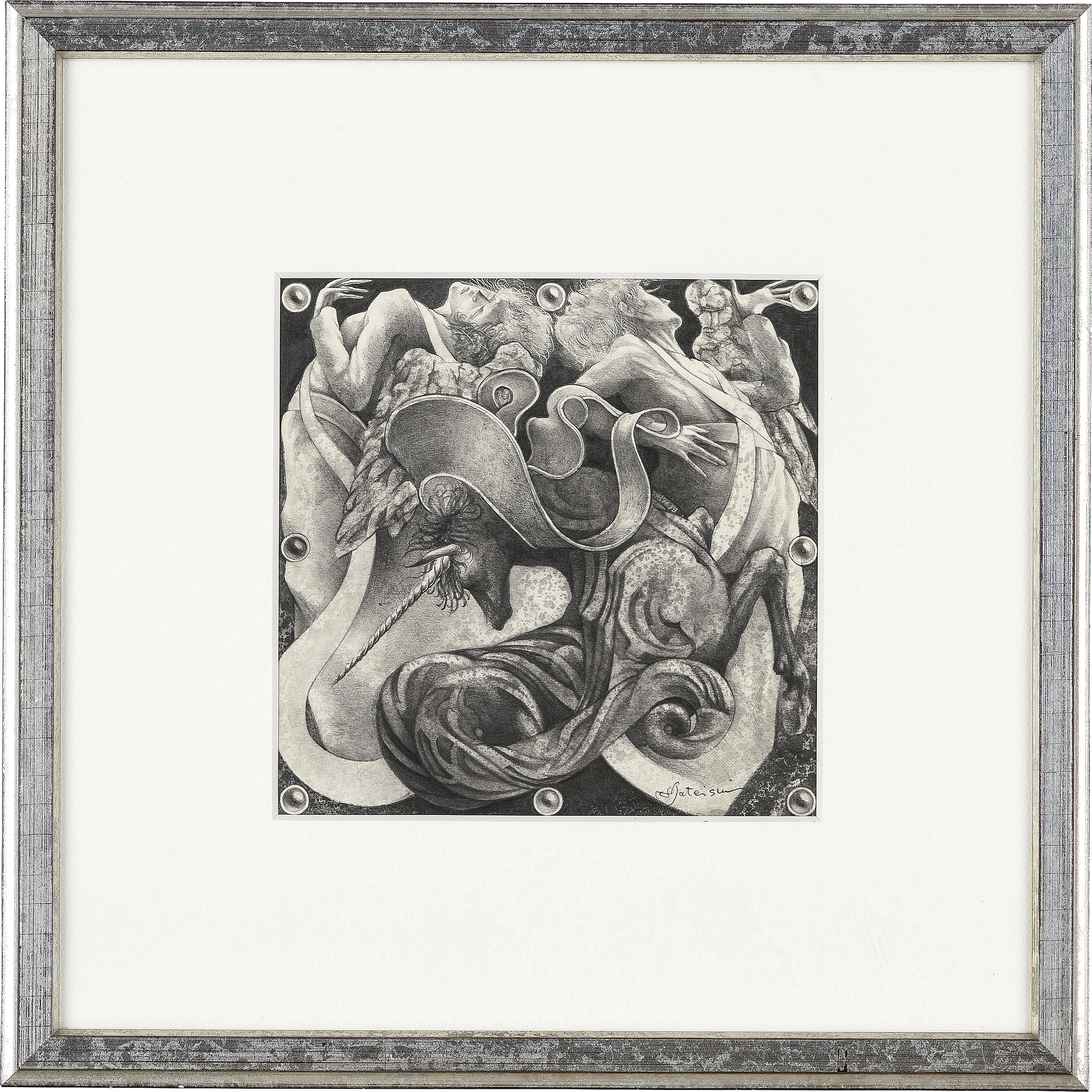 厚紙に鉛筆 18.7×18.7(額窓)cm サイン有 作品はマットに固定 画面全体に薄いヤケ 額付