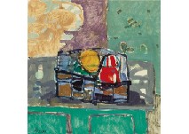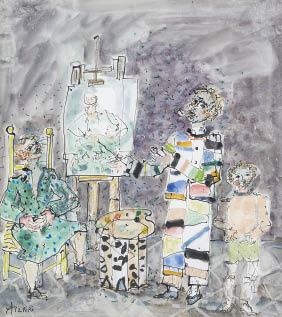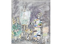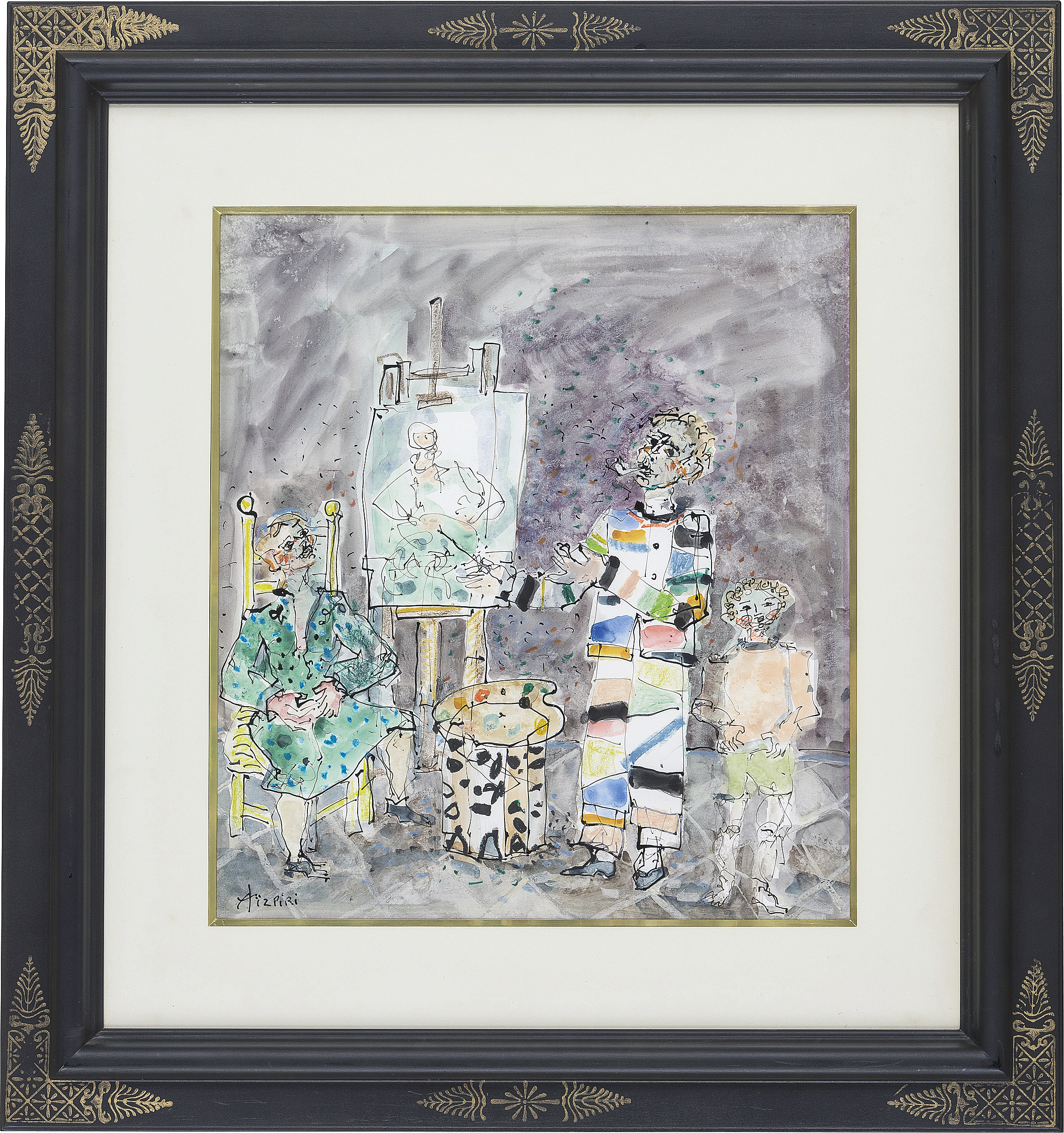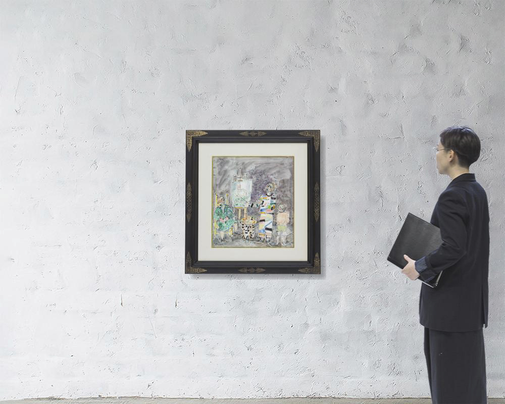 紙に水彩・インク・クレヨン 50.2×45(紙)cm サイン有 額裏にもサイン、献辞 画面全体に薄いヤケ、四隅にピンホール 額付