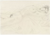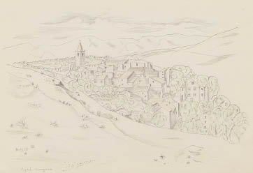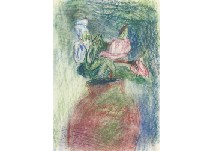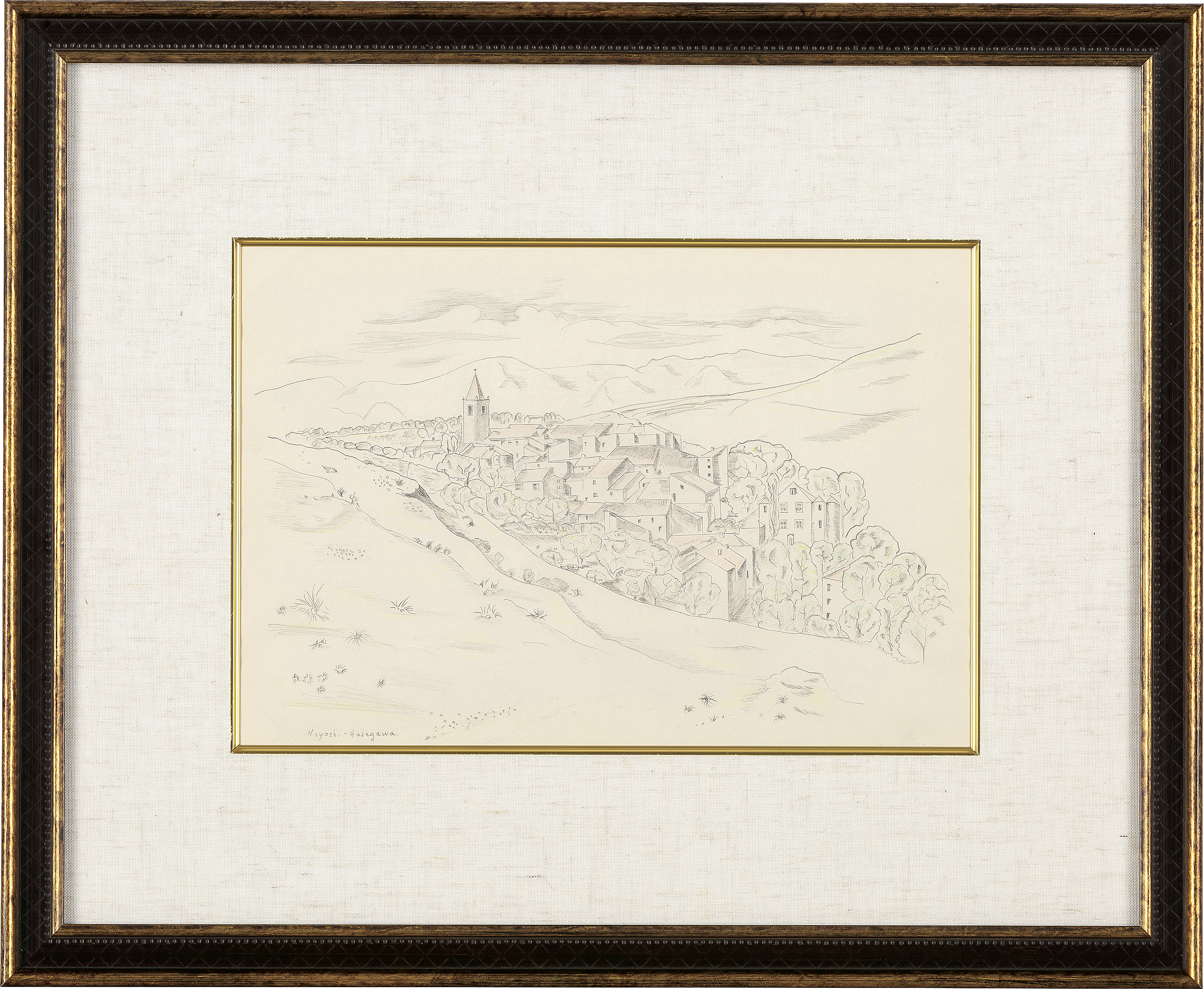 紙に鉛筆・色鉛筆 27×35.2(紙)cm サイン有 紙裏にスタンプサイン 画面全体に薄いヤケ、数ヶ所に薄いシミ、シワ 額付