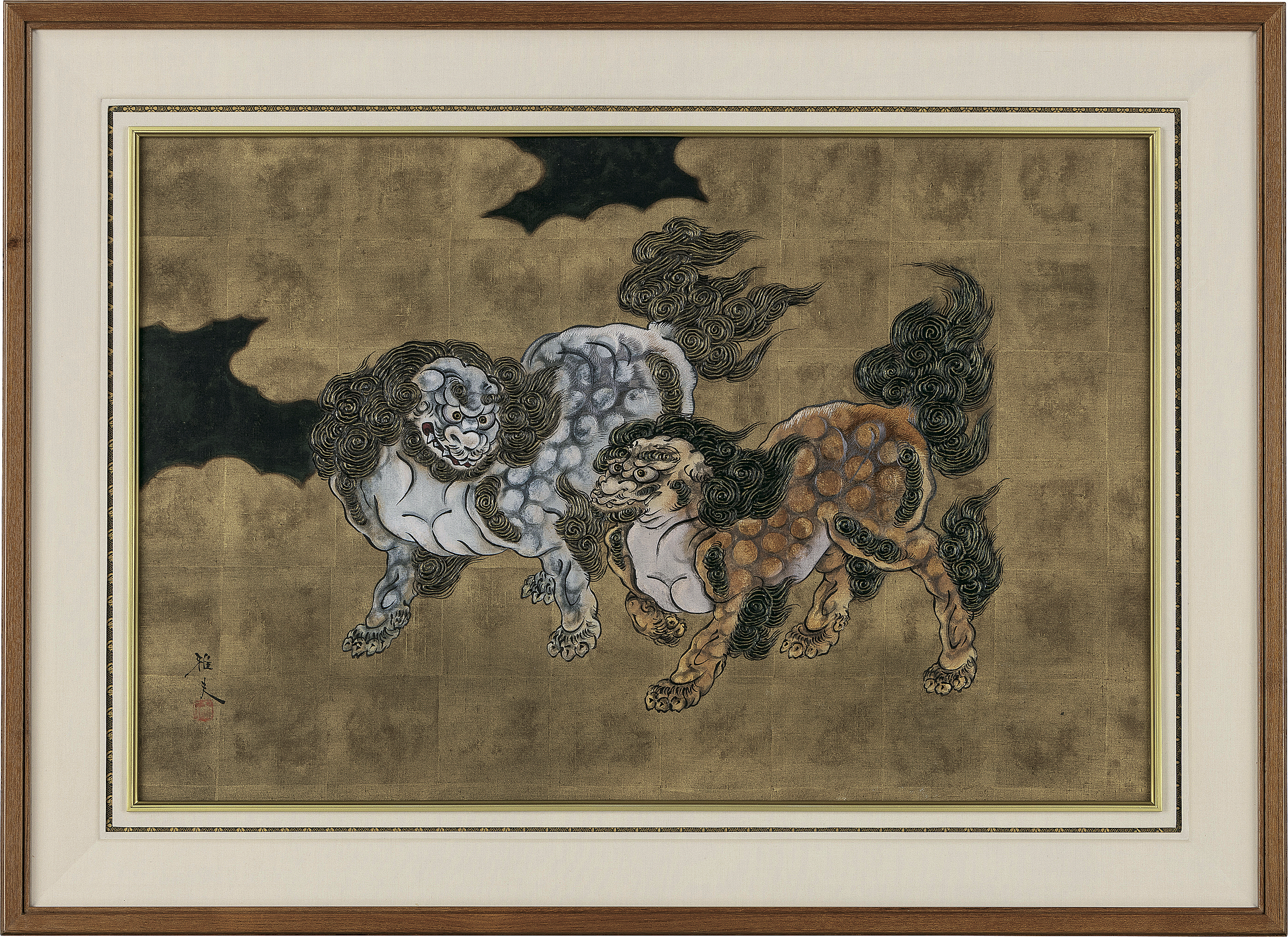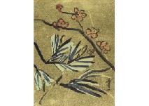 パネルに貼付した布にアクリル・刺繍 68×101.5cm サインと印有 画面隅1ヶ所にピンホール 額付