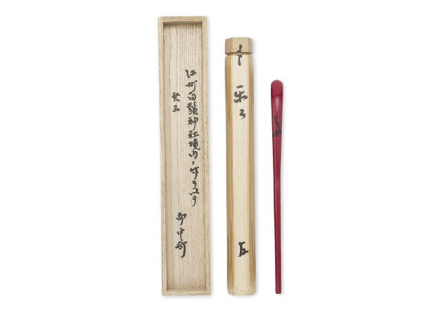 L18.6cm 二十五本ノ内 江州白鬚神社境内ノ竹ヲ以テ 塗は中村宗哲(箱底部に印) 裏面に在判 共筒 共箱 黒田正玄下削