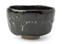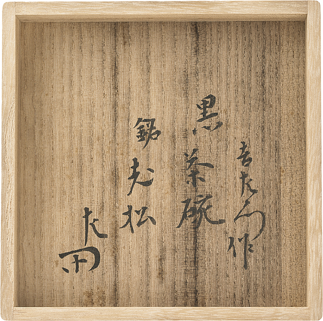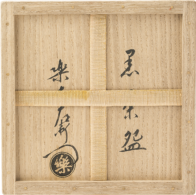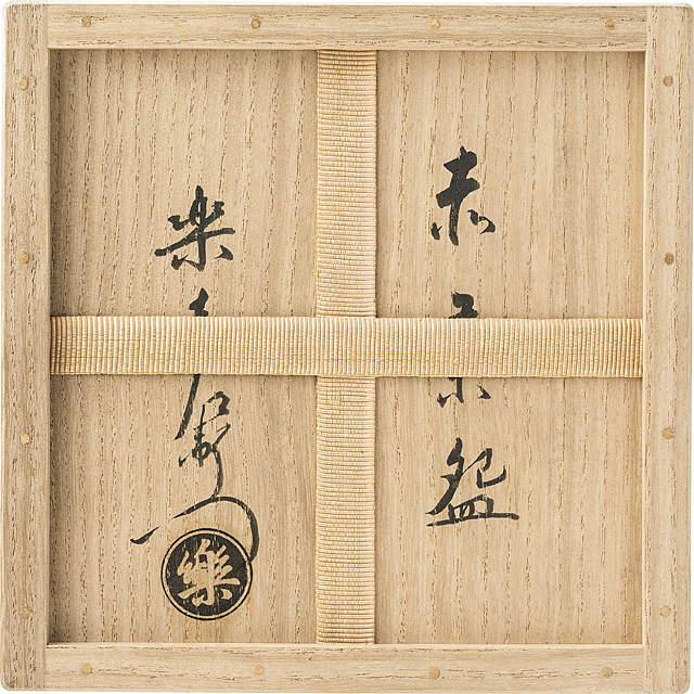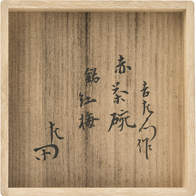 「黒茶碗 銘 老松」/H8×W11.8cm 「赤茶碗 銘 紅梅」/H8×W12.3cm 各高台脇に印銘「楽」 各共箱、惺斎書付