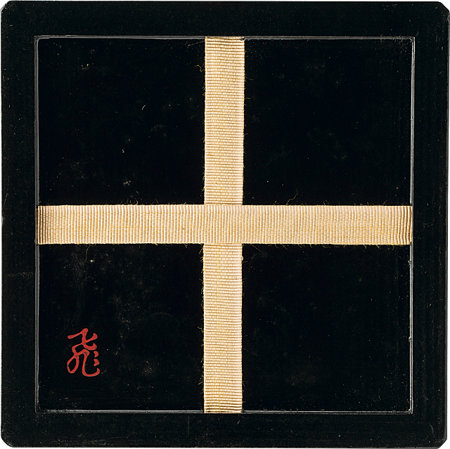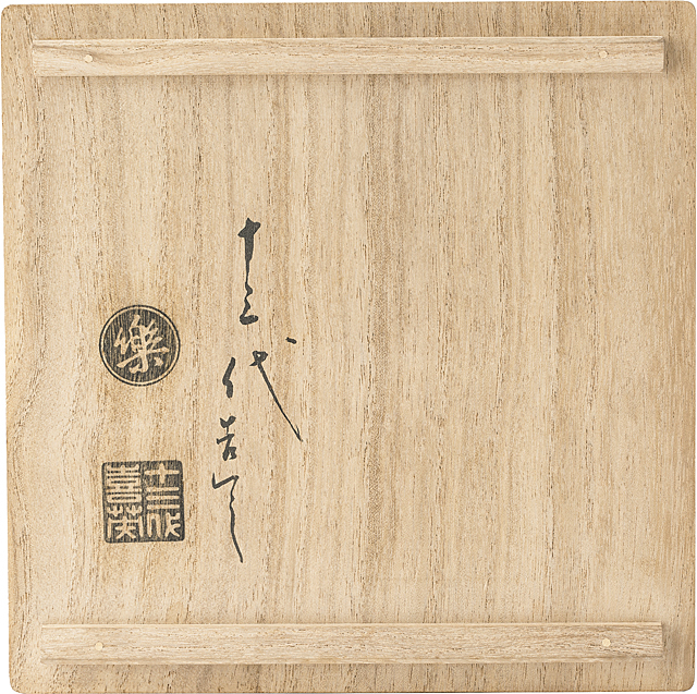 H9.7×W11.8cm 高台脇に印銘「楽」 惺斎箱(側部に円相の刻、在判 箱は飛来一閑) 共外箱(箱に飛来一閑の印有)