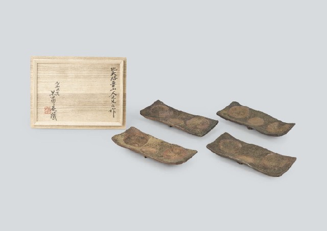 【Lot1098】 備前土牡丹餅文長角皿 四客入