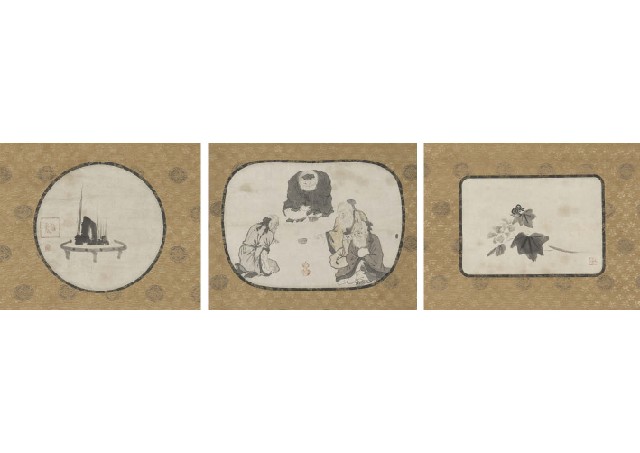 - 各印有、軸装 「芙蓉図」/紙に墨 16.4×24.1(紙)cm 全体:103.1×45.6cm 「商山四皓図」/紙に彩色 20.7×29.7(紙)cm 全体:103.1×45.7cm 「石菖図」/紙に墨 20.1×20.4(紙)cm 全体:103.1×45.5cm 各シミ 箱付(箱にイタミ) 「米國アイ、ドウマン氏及某家書畫器物展觀入札」(東京美術倶楽部 1922年)目録No.5に掲載