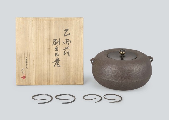 H16.8×W28.2cm 側部に鋳込銘「志山」 サビ 共箱 釜鐶2点付