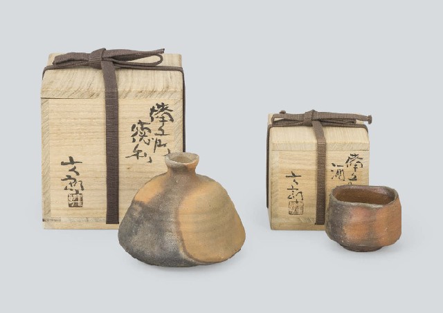 「備前徳利」/H10×W12.4cm 底部に掻き銘 「備前酒呑」/H5.5×W7cm 高台内に掻き銘 2点とも共箱
