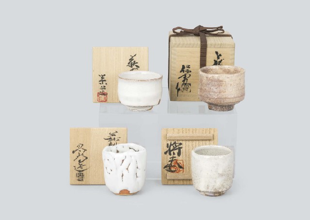 兼田昌尚「萩刳貫ぐい呑」/H6.6×W6.2cm 側底部に掻き銘 三輪栄造「萩ぐい呑」/H5×W6.6cm 高台脇に印銘「栄造」 吉賀将夫「萩ぐい呑」/H6.3×W5.9cm 高台脇に掻き銘「将」 大和保男「萩ぐい呑」/H5.9×W6.9cm 高台脇に印銘「保」 4点とも共箱