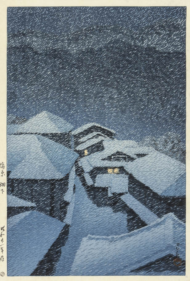 木版 36.4×24.3cm 落款と印共に版上 マージンに「ワタナベ」の印 シート全体にヤケ マージン縁沿い1ヶ所に小さな穴 マージン及び裏面所々にシミ 額付