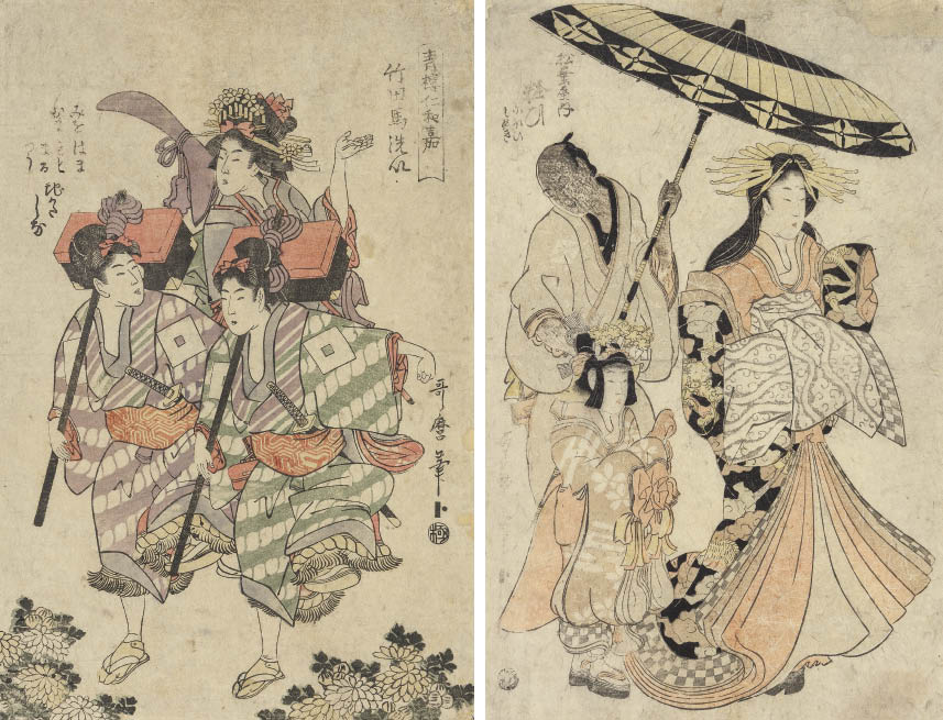 木版 34.4×23.1(シート)cm 版上落款 版元印 極印 和紙による裏打ち もう1点は二代喜多川歌麿【松葉屋内 粧ひ にほひ とめき】(木版 38×24.3(シート)cm 版上落款、版元印、極印(いずれも不鮮明)) ※詳しいコンディションについてはお問い合わせください。