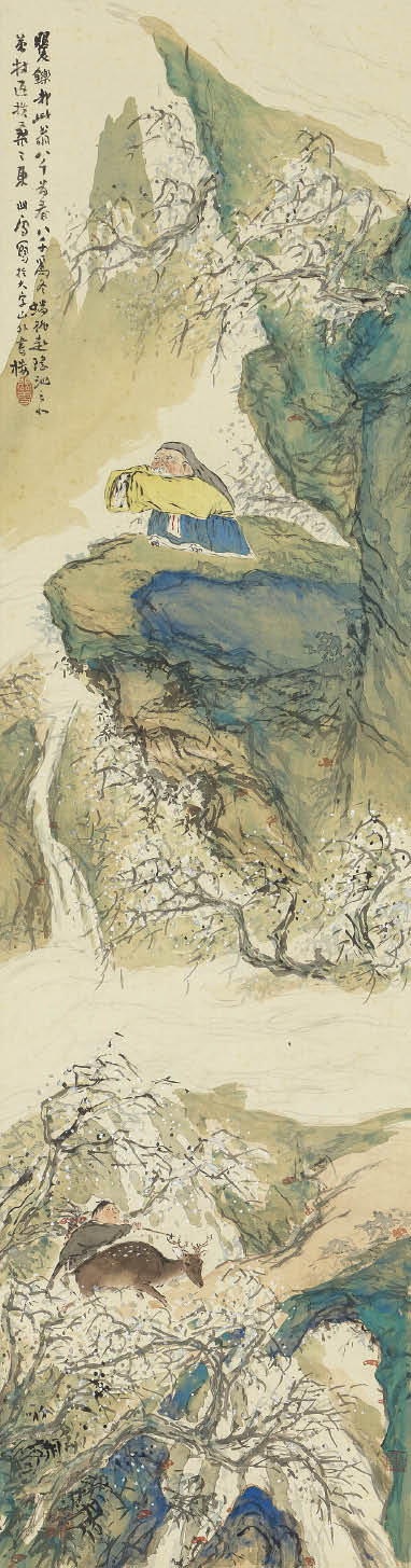 絹本・彩色 134.5×35.8cm 落款と印有 軸装 画面全体に薄いヤケ、所々にシミ、数ヶ所に小さな剥落 共箱