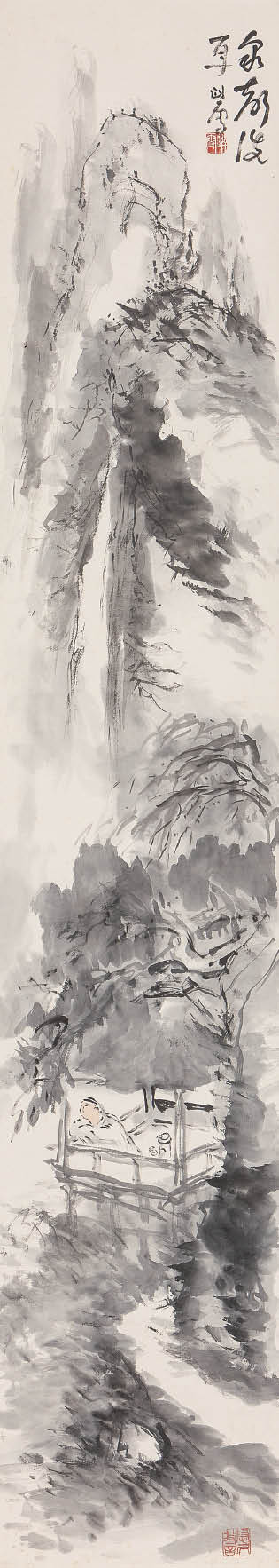 紙本・墨彩 146.3×26.5cm 落款と印有 軸装 画面全体に薄いヤケ、所々にシミ 共箱