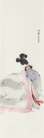 紙本・彩色 94.1×30.8cm 落款と印有 軸装 画面全体に薄いヤケ、数ヶ所に小さなシミ、わずかなヨゴレ 共箱
