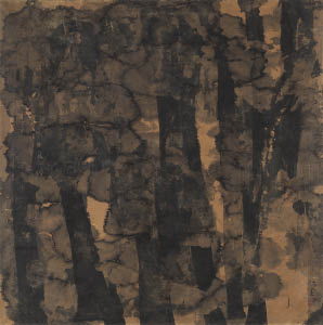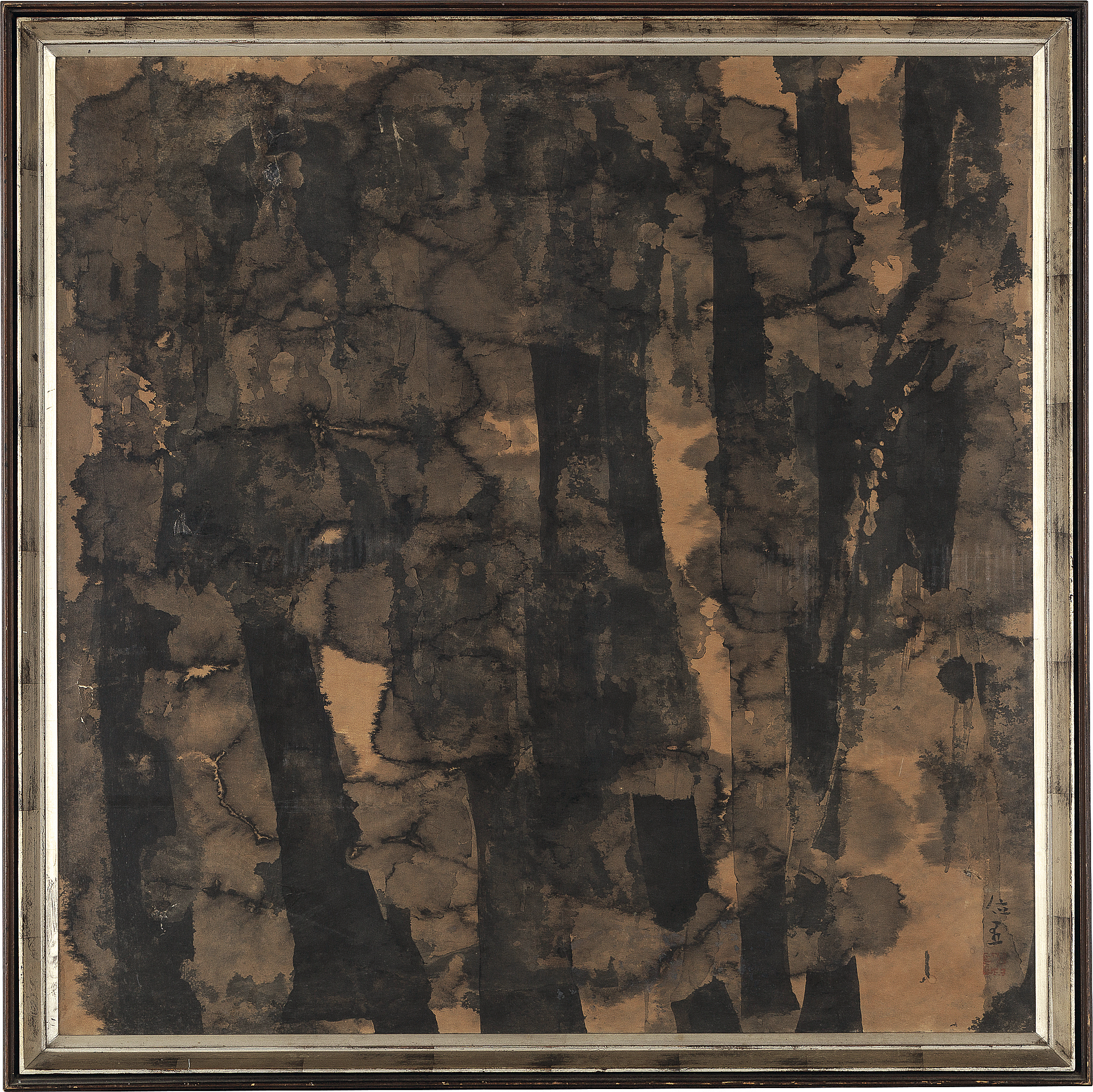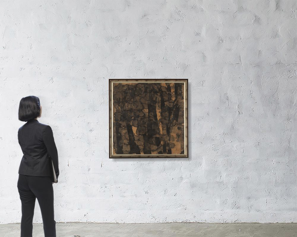 昭和43年(1968年) 紙本・水墨 90.7×90.7cm 落款と印有 共シール 画面全体にヤケ、数ヶ所にシミ、シワ、紙の毛羽立ち、ヤブレ、紙の欠損、ピンホール、修復 額付