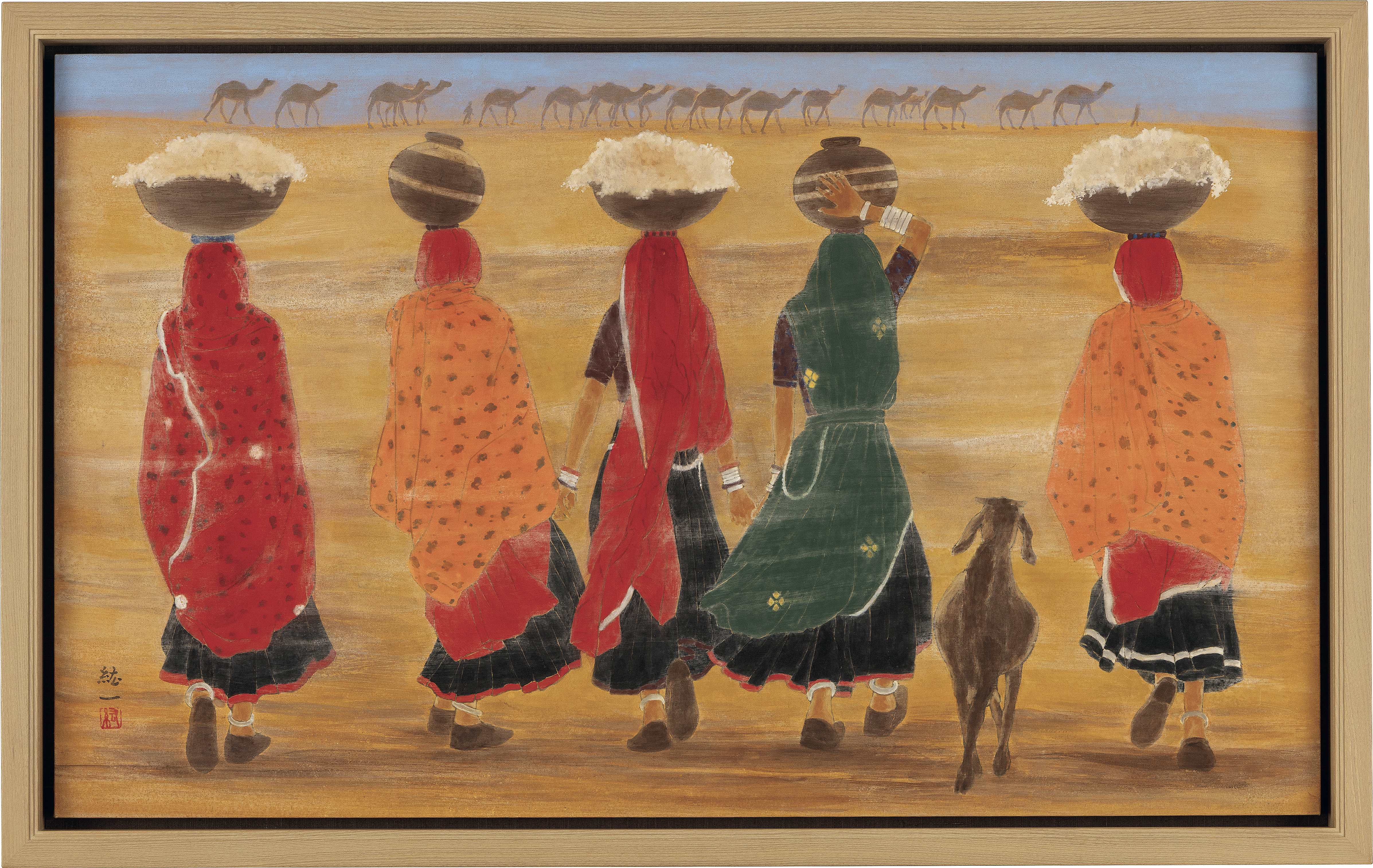 紙本・彩色 55×90.8cm(変形30号) 落款と印有 共シール 画面数ヶ所にヒビ もう1点は【馬】(紙本・彩色 D65cm 落款と印有 共シール) 2点共額付
