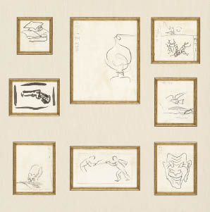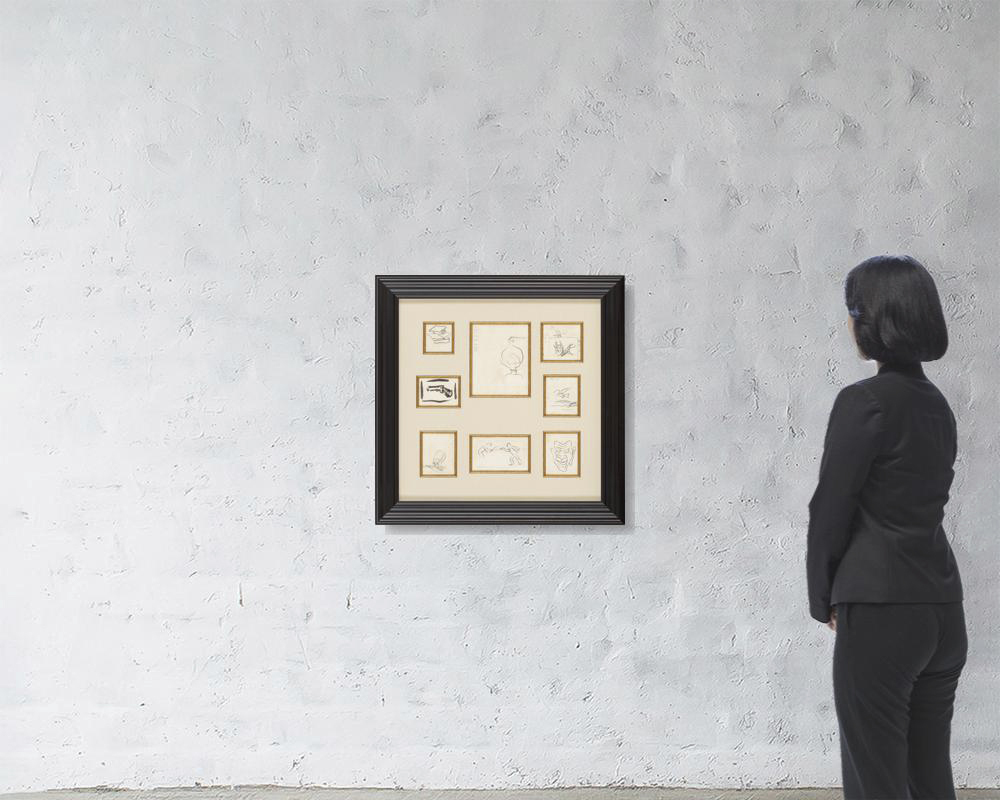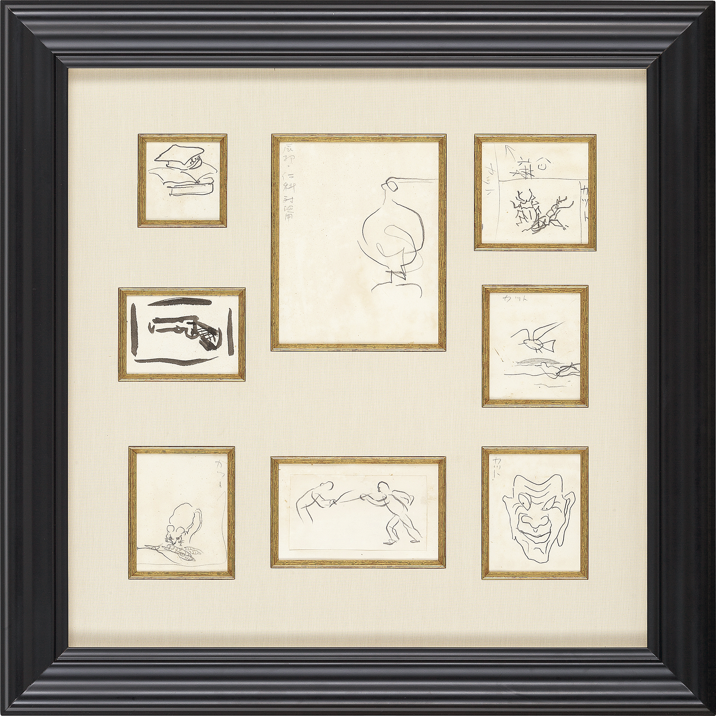 紙に鉛筆7点、紙に水墨1点の8点セット 9.5×7.4~22×16.8cm 1点の作品は裏面数ヶ所を紙に貼付 いずれも画面全体にヤケ 数枚の所々にシミ、数ヶ所にシミ、シワ、ヨゴレ 額付