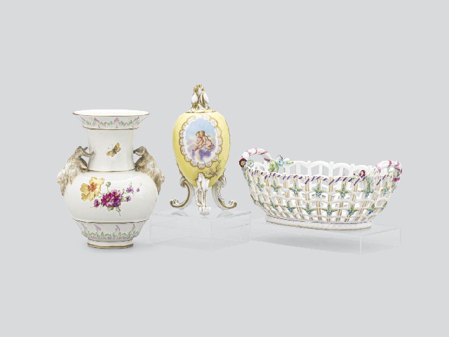 花虫文花瓶/H16.8cm 天使文三脚蓋物/H16.3cm 蓋の装飾にカケ 花文透しバスケット/H9.1×W24×16.8cm 透し1ヶ所にクラック 各底部に窯印