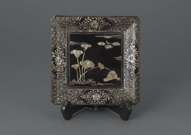 【Lot0145】 螺鈿月下蓮文入隅四方盆