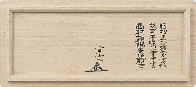 H10.6×W6cm 箱付(箱蓋表の字は松平不昧) 小堀宗実外箱 仕覆2点、挽家付(挽家蓋の字形は松平不昧) 「當市西村朝陽庵氏所藏品」(京都美術倶楽部 1929年)目録No.48に掲載 同目録付