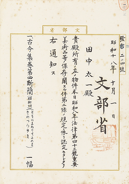 紙に墨 軸装 22.6×15.8(紙)cm 全体/128×45cm ムシクイ 谷辺橘南箱 重要美術品認定通知書 文献:國立博物館編 「重要美術品等認定物件目錄(追加)」(好學社刊 1948年) P.135に文字情報掲載