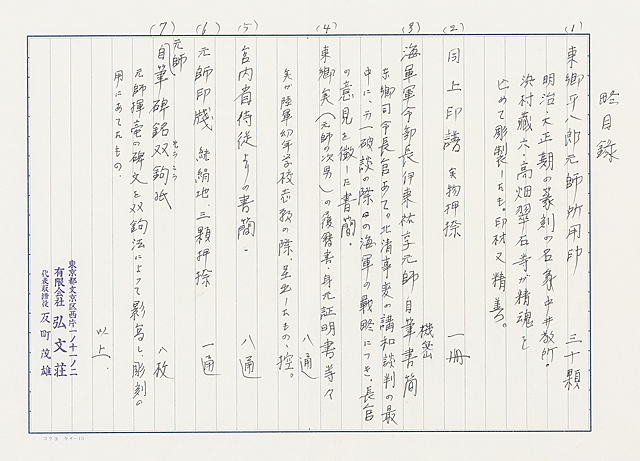 自詠色紙帖/各色紙に墨、落款有 27.4×24.3(本)cm 東郷彪箱 他、自用印(30点)、印譜2帖、書簡巻物2点、関係書類各種 いずれも弘文荘反町茂雄旧蔵(同目録付)