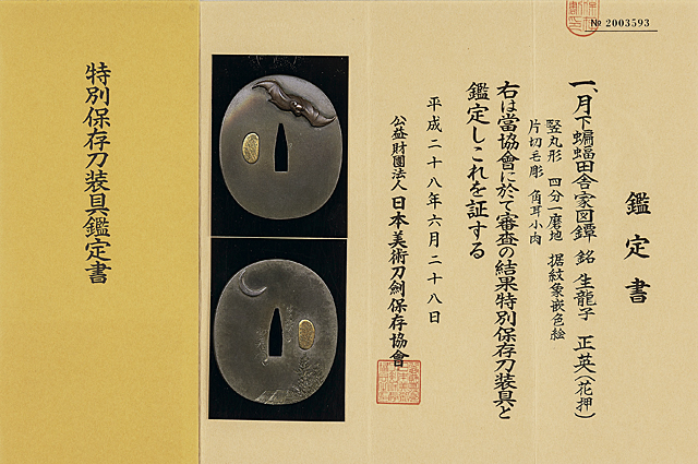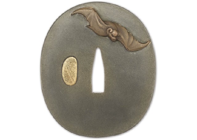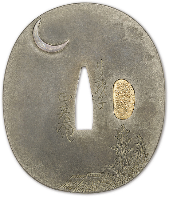 【Lot0281】 月下蝙蝠田舎家図鐔 銘 生龍子正英(花押)