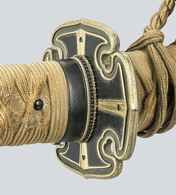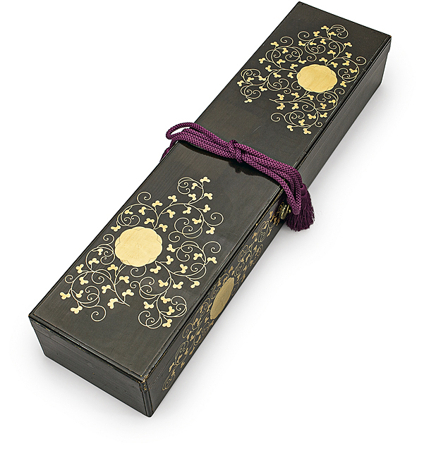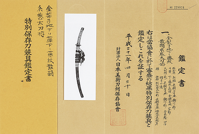 全長約83.5cm 総金具:赤銅石目地、鋤下彫 目貫:下リ藤紋三双図、金鍍金地、容彫 大切羽(二枚):赤銅石目地、鋤下彫、金色絵、四方猪目小透 鐔:刳込葵瓜形、赤銅石目地、桶底金色絵耳 日本美術刀剣保存協会特別保存刀装具鑑定書(平成21年) 蒔絵箱付