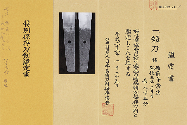 刀身/刃長25.2cm 元幅2.5cm 銘「備前介宗次/弘化三年二月日」 日本美術刀剣保存協会特別保存刀剣鑑定書(平成25年) 銃砲刀剣類登録証 白鞘入 拵/全長約38.5cm 小柄欠