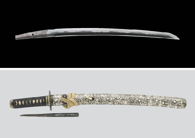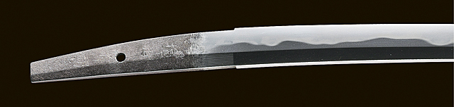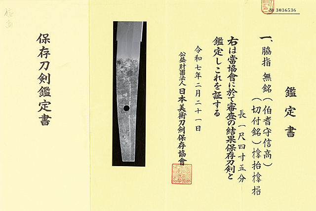 刀身/刃長43.9cm 反り0.8cm 元幅2.9cm 元幅2.0cm 銘「□抬□□」 日本美術刀剣保存協会保存刀剣鑑定書(令和7年) 銃砲刀剣類登録証 白鞘入 拵/全長約62cm 小柄に在銘
