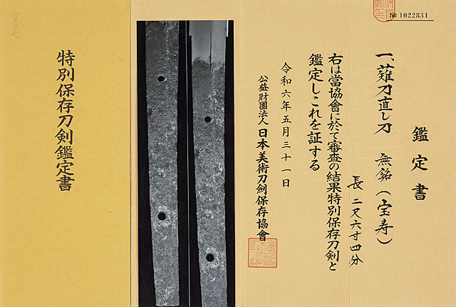 刀身/刃長80.2cm 反り2.4cm 元幅3.1cm 無銘 刃こぼれ 日本美術刀剣保存協会特別保存刀剣鑑定書(令和6年) 銃砲刀剣類登録証 白鞘入