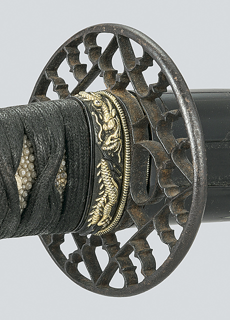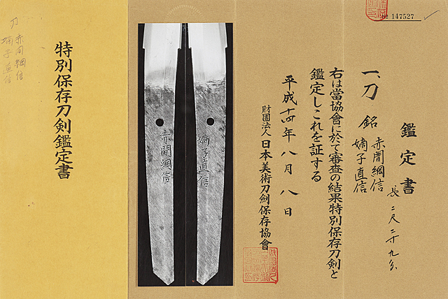 刀身/刃長69.3cm 反り2.2cm 元幅3.2cm 先幅2.2cm 銘「赤間綱信/嫡子直信」 日本美術刀剣保存協会特別保存刀剣鑑定書(平成14年) 銃砲刀剣類登録証 白鞘入 拵/全長約99cm 笄欠