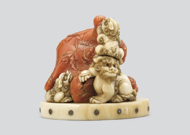 【Lot0322】 象牙珊瑚唐獅子牡丹根付