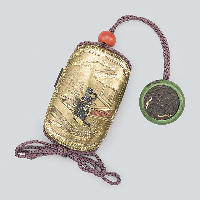 【Lot0325】 蒔絵牽牛織女文印籠 附)龍文鏡蓋根付