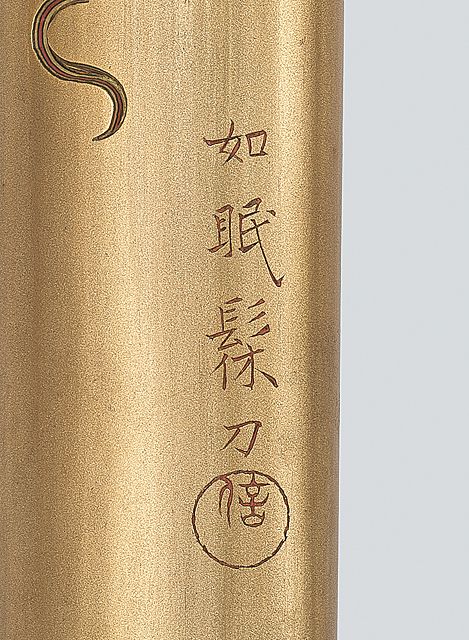 笠水仙金具煙草入/H7.7×W12.9×3.4cm 堆漆倶利文煙管筒/L23.7cm 側部に刻銘「如眠髹刀」 箱付 緒締付