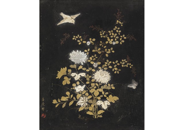 【Lot0345】 芝山象嵌花鳥蝶文蒔絵額