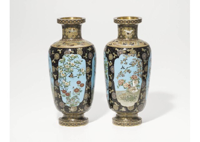 【Lot0400】 七宝四方割花鳥文花瓶(一対)