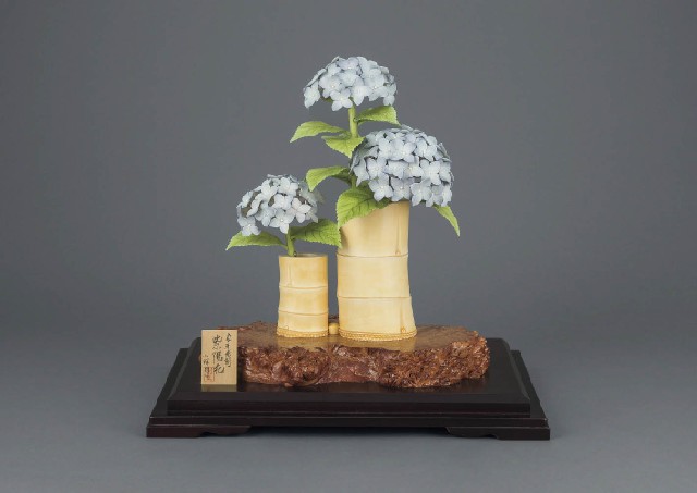 H46.5×W49.3×36.3(台座含む)cm 作品は台座に固定されている 立札に描き銘「小澤則生」 箱無 作家証明書 新日本象牙美術彫刻研究所保証書 木製台座付