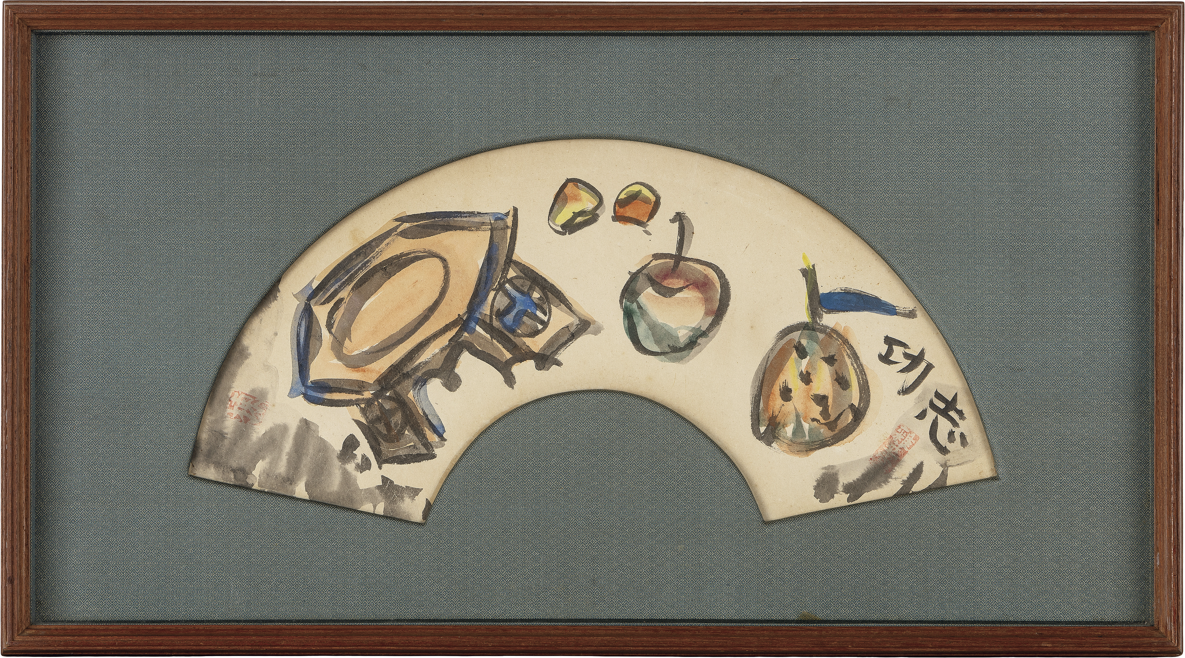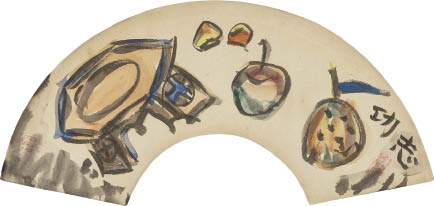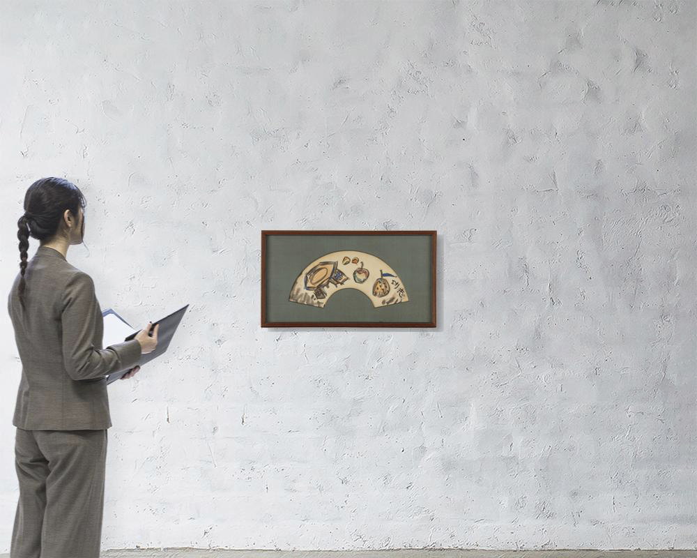 倭絵(紙本・彩色) 14.2×47.5(扇面型)cm 落款と印有 画面全体にヤケ、数ヶ所にシミ 額付