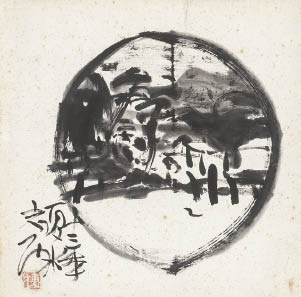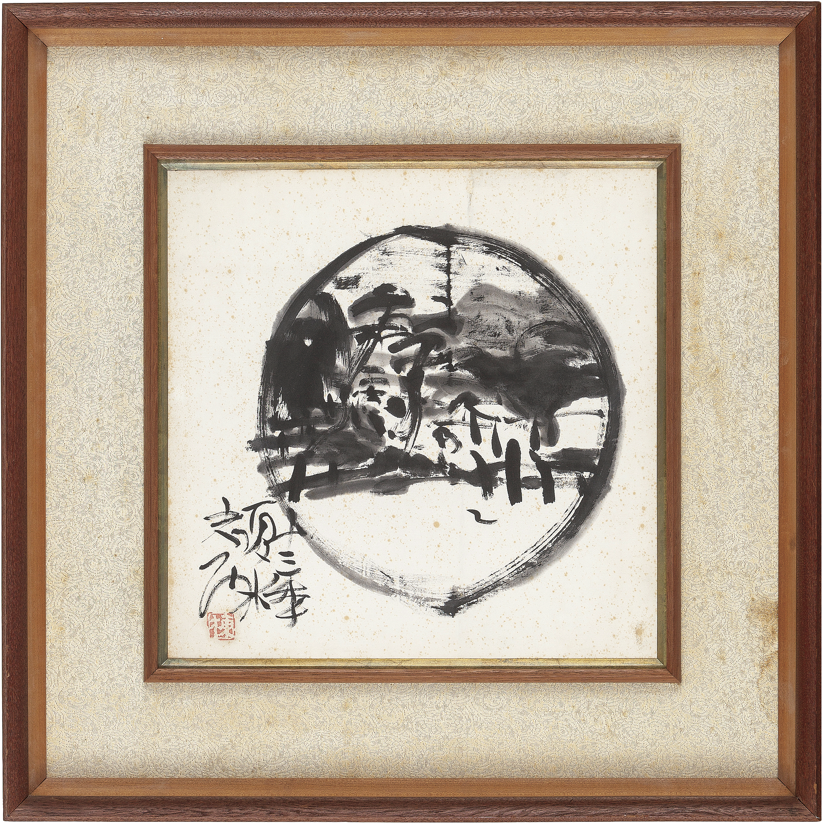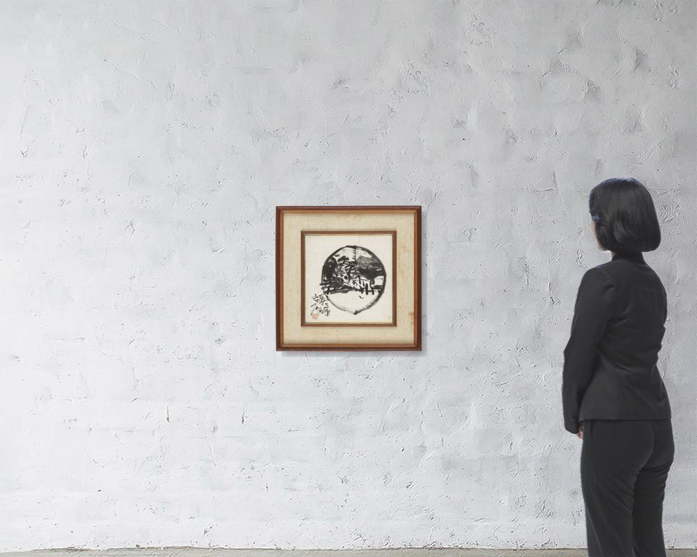 倭絵(紙本・水墨) 35×34.7cm 落款と印有 画面全体に薄いヤケ、所々にシミ、縁沿い1ヶ所に紙の欠損 額付