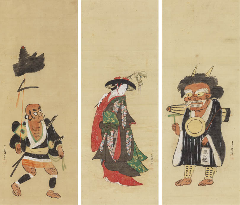 絹本・彩色 81.2×31.2(各)cm 各落款と印有 各軸装 いずれも画面全体に薄いヤケ、所々にシミ、数ヶ所にヨゴレ、剥落 1点の画面数ヶ所にヒビ、修復 箱付