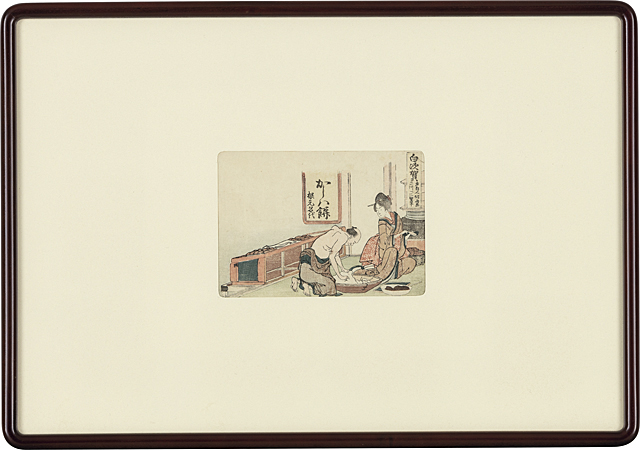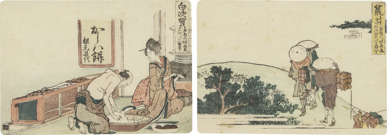 木版 11.7×16.6cm 版上落款 もう1点は【春興五十三駄之内 荒井 白須賀へ一里廿六丁】(11.9×16.7cm 他は表題と同データ) いずれも作品は裏面縁沿い2ヶ所を台紙に貼付 ※詳しいコンディションについてはお問い合わせください。 2点共額付