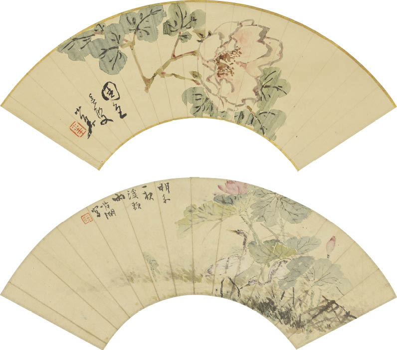 渡辺小華/紙本・彩色 11.5×38.5(扇面型)cm 奥原晴湖/絖本・彩色 11×37(扇面型)cm 各落款と印有 軸装 いずれも画面全体に薄いヤケ、数ヶ所にシミ、シワ 「山下青城」鑑題箱