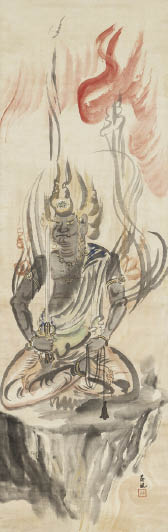昭和癸未(1943年) 絖本・彩色 137.5×44cm 落款と印有 軸装 画面全体に薄いヤケ、所々にシミ、数ヶ所にわずかなシワ、わずかな絖本のホツレ、縁沿い1ヶ所に小さな絖本の欠損 「堅山壽子」鑑題シール 共箱