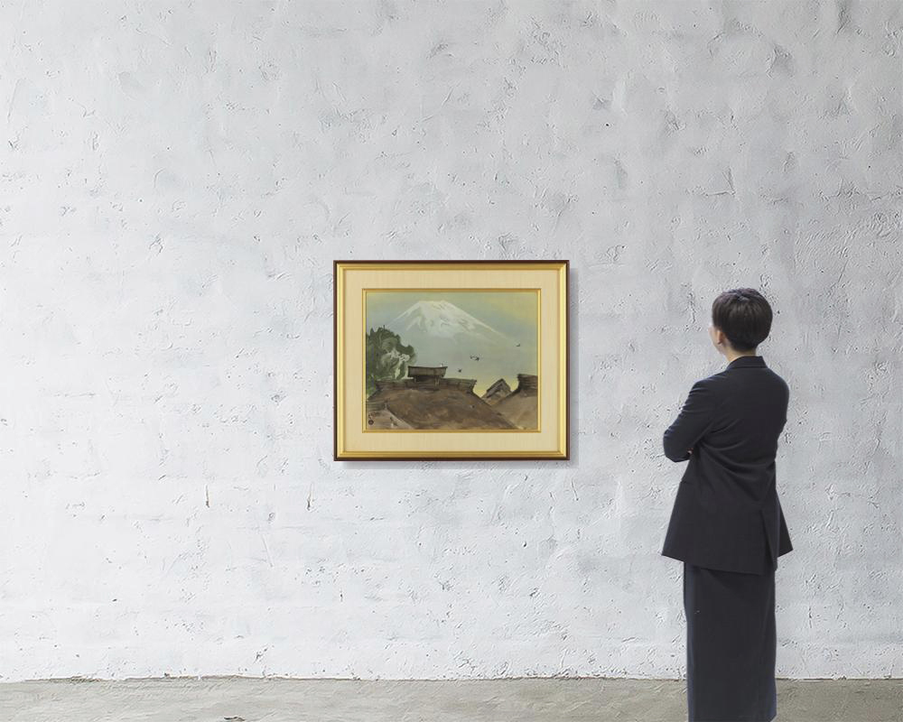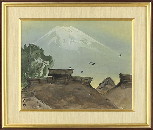 絹本・彩色 57.4×71.5cm 落款と印有 共シール 画面全体に薄いヤケ、数ヶ所にシミ 額付