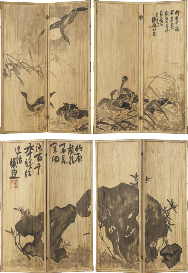 板に墨彩 152×113.6(各屏風)cm 1点に落款と印 いずれも画面所々に小さなシミ、数ヶ所にわずかなキズ、虫食い 1点の画面縁沿い1ヶ所に板の欠損 共箱
