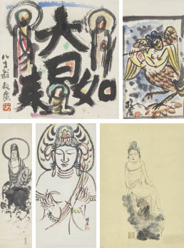 紙本・彩色 68.4×68.5cm 落款と印有 軸装 画面全体に薄いヤケ、数ヶ所にシミ、縁沿い1ヶ所に小さな紙の欠損 共箱 他は【迦稜頻伽】(紙本・彩色 65.8×34.3cm 落款と印有 軸装 画面全体に薄いヤケ、数ヶ所にシミ、わずかなシワ、修復 共箱)【観音】(紙本・墨彩 138.3×35.7cm 落款と印有 軸装 画面全体に薄いヤケ、数ヶ所にシミ、わずかなシワ、縁沿い2ヶ所に紙の欠損 箱付)【聖観世音菩薩】(紙本・彩色 64×31cm 落款と印有 軸装 画面全体に薄いヤケ、数ヶ所にシミ 箱付)【巌座観音】(紙本・彩色 50.3×33.5cm 印有 軸装 画面全体にヤケ、数ヶ所にシミ、小さな紙の欠損、修復 箱付)