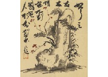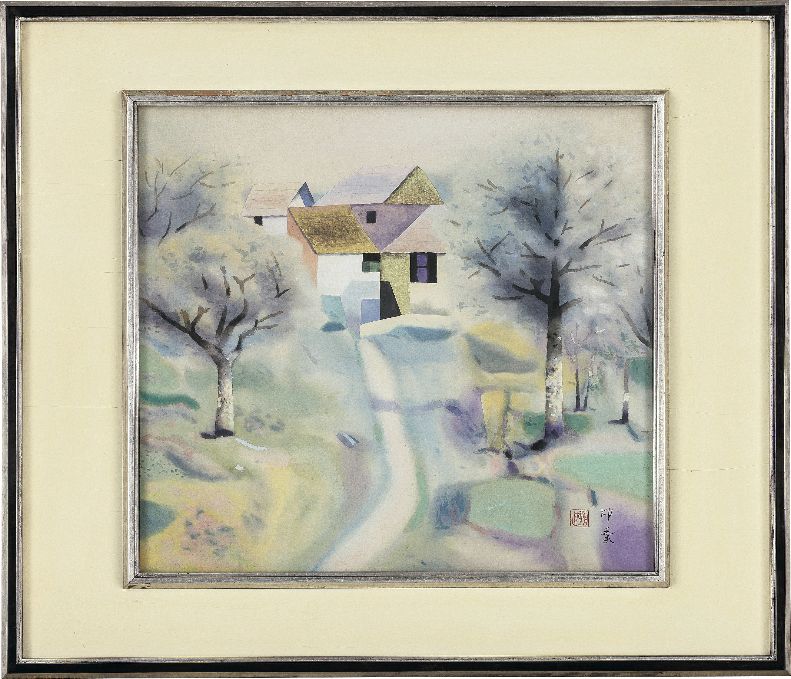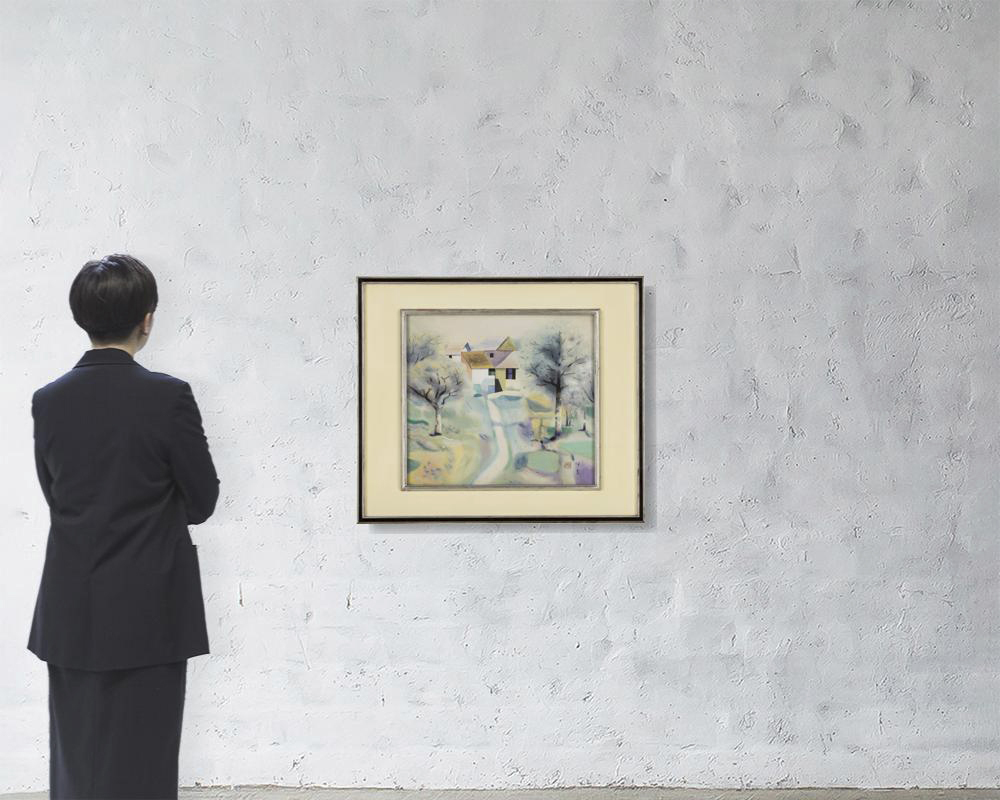 絹本・彩色 46.8×51.5cm 落款と印有 画面全体に薄いヤケ、数ヶ所にシミ、小さな剥落 共箱 額付
