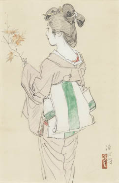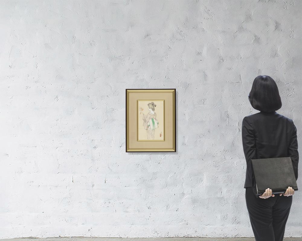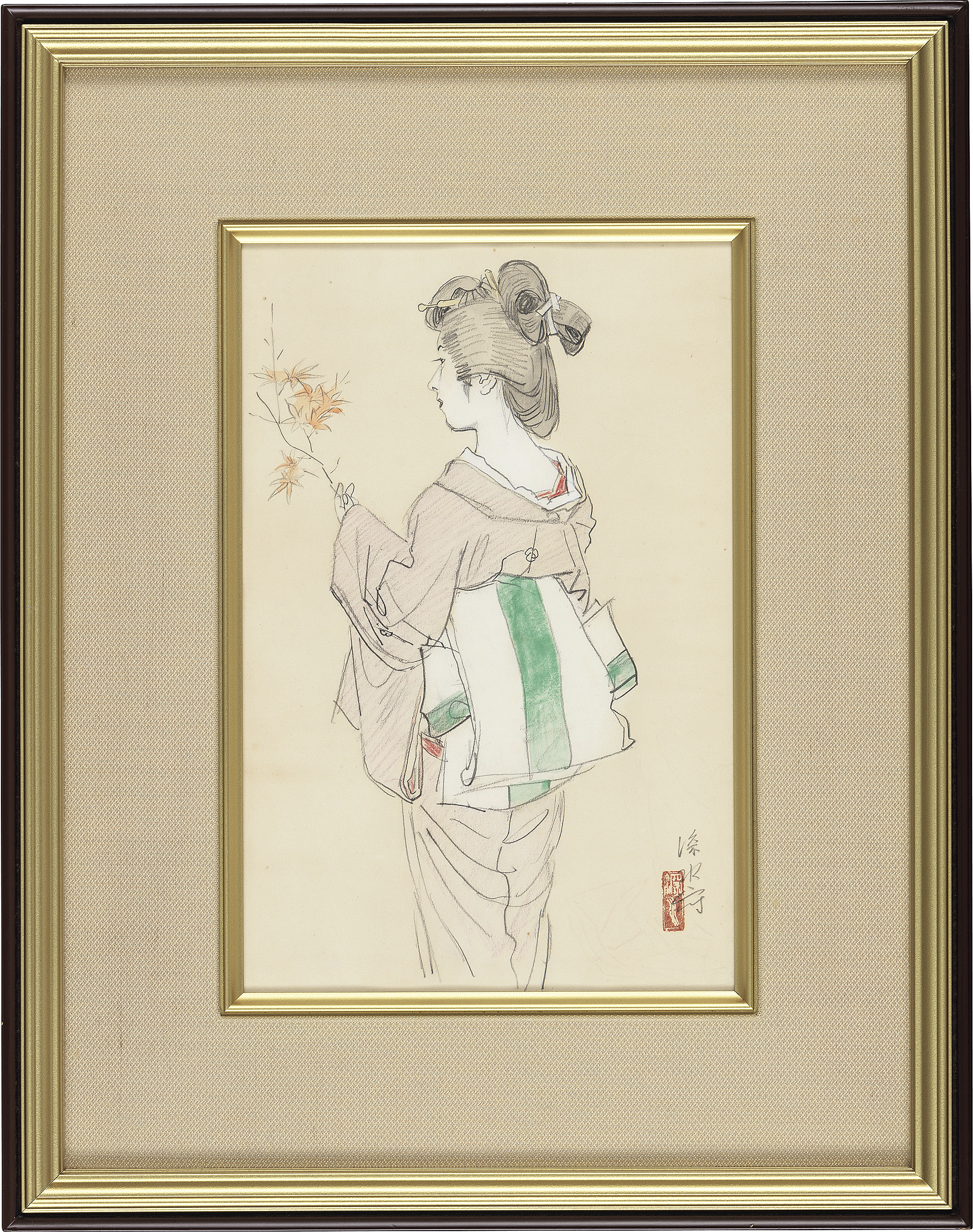 紙に鉛筆・色鉛筆・彩色 35.7×23.6cm 落款と印有 共シール 画面全体に薄いヤケ、数ヶ所にシミ 額付