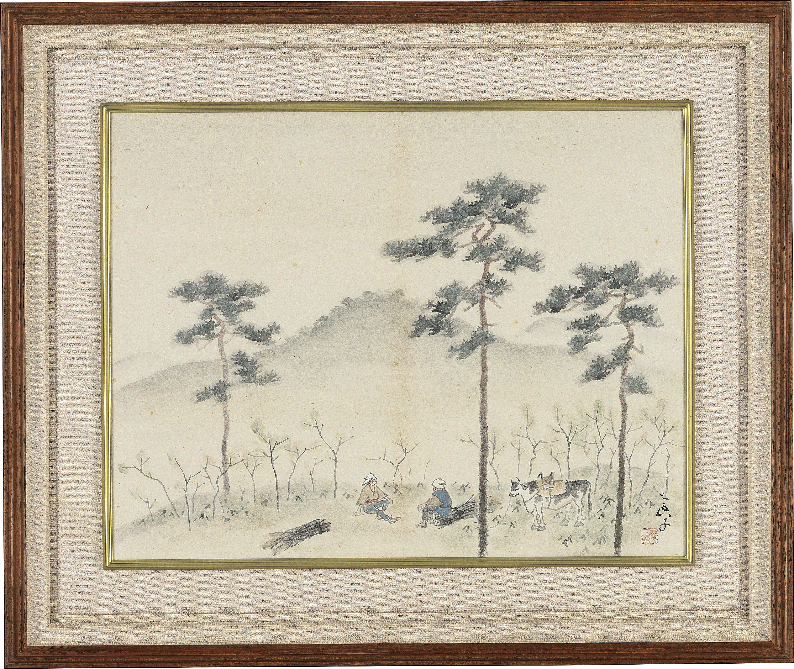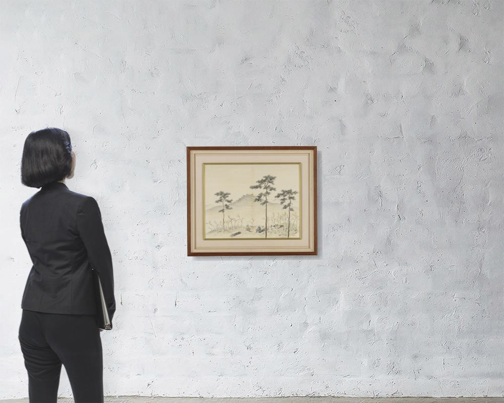 紙本・墨彩 40.1×51.3cm 落款と印有 画面全体に薄いヤケ、所々にシミ 共箱 額付