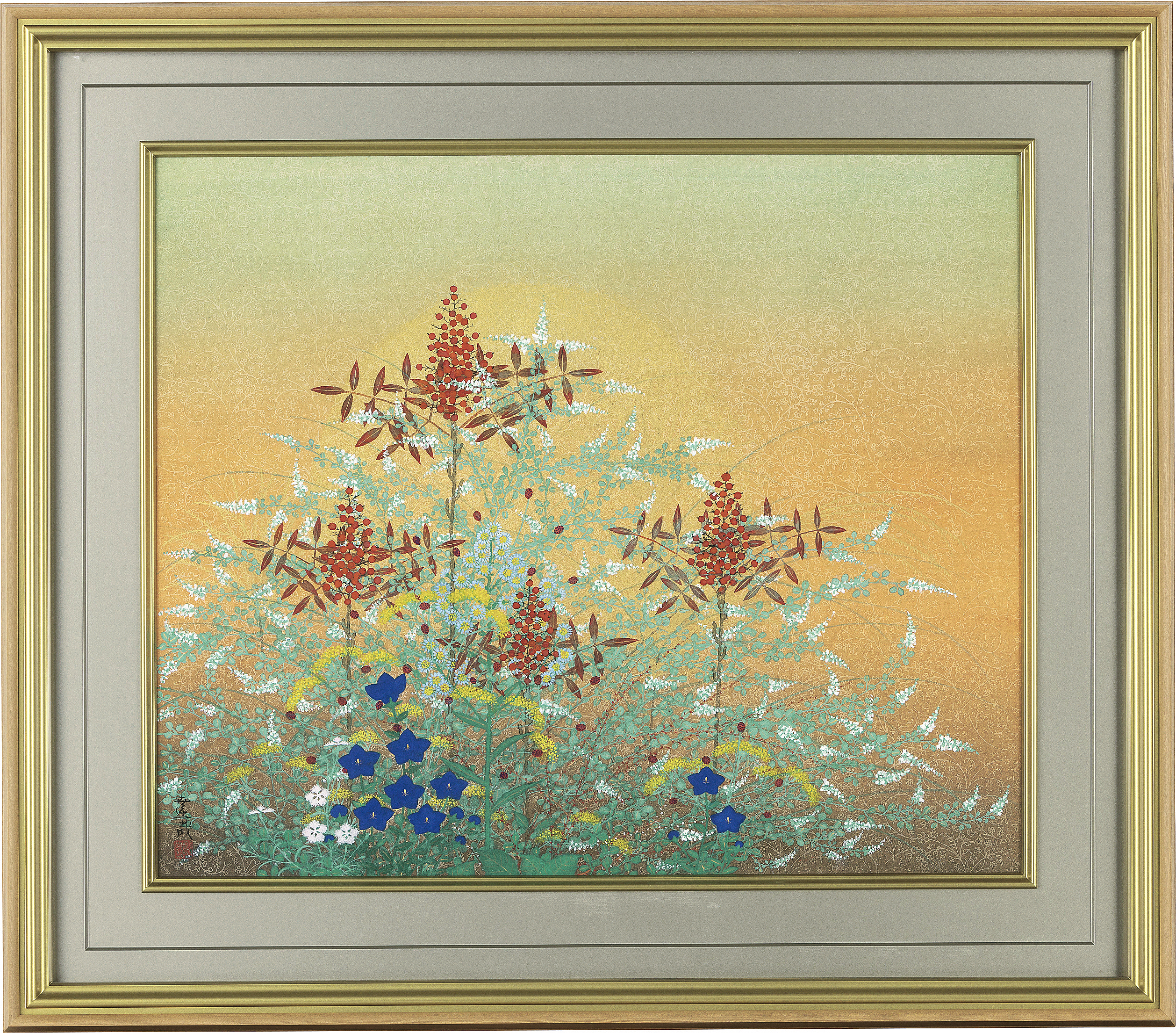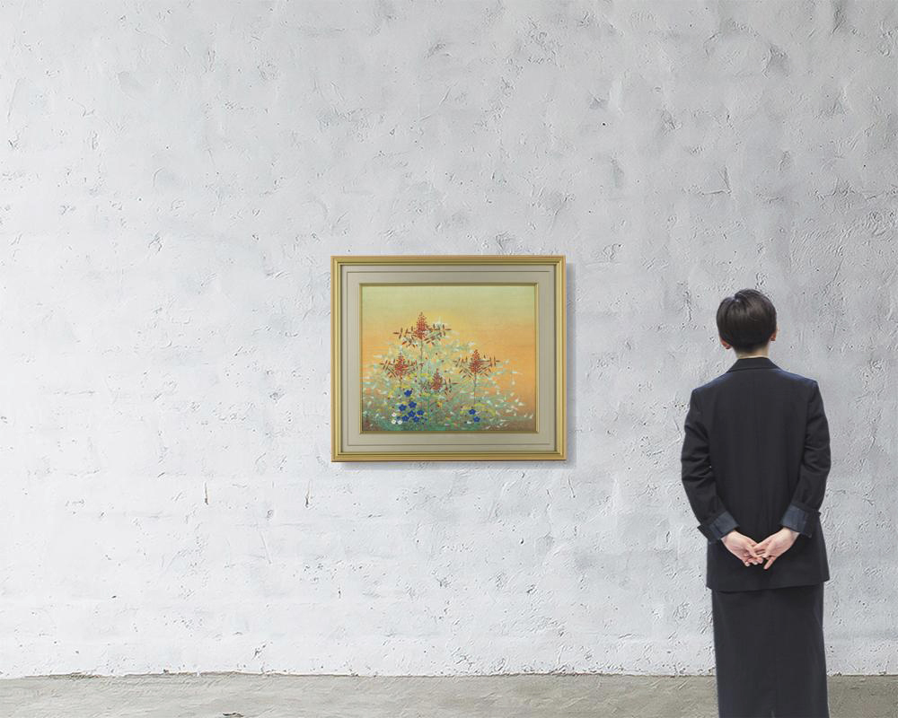 紙本・彩色 20号 落款と印有 共シール 画面1ヶ所にわずかな絵具の浮き 額付
